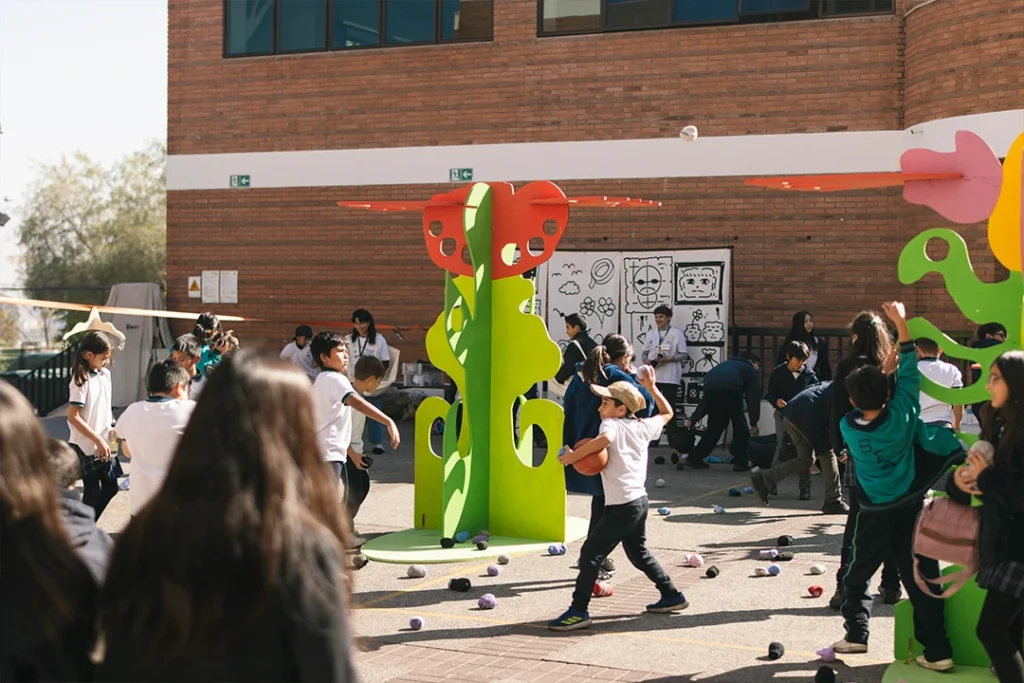 Al sonar la campana, los niños y niñas salen corriendo al patio. Pero algo es distinto: enormes flores de madera con agujeros esperan en medio del recreo, junto a calcetines convertidos en pelotas, listos para encestar. En otro colegio, un montón de trompos aguarda ser construido y lanzado. La curiosidad se mezcla con la emoción: ¿qué vamos a hacer? ¿Quién puede participar? En estos recreos, lo cotidiano se transforma en un espacio de juego, encuentro y descubrimiento.