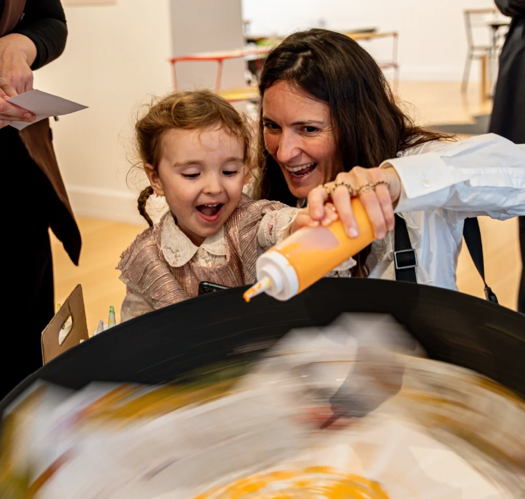 Mientras esto ocurría en una de nuestras salas, en el taller de al lado niñas y niños creaban títeres sin prisa. Como todos los viernes por la tarde, abrimos las puertas a la comunidad de manera gratuita, ofreciendo nuestro espacio, materiales, juegos y actividades. Niñas y niños construían títeres, dibujaban y jugaban acompañados por sus madres y padres, guiados por una artista-profesora que los ayudaba a dar forma a sus ideas. Ese cruce entre lo formativo y lo lúdico, entre docentes y familias, terminó de darle sentido a la jornada: un mismo espacio acogiendo múltiples formas de encuentro, creación y aprendizaje.
