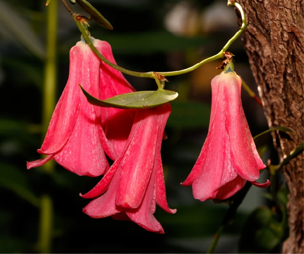 Un poco más al sur, en los bosques húmedos del centro-sur de Chile, crece el copihue (Lapageria rosea), flor nacional y enredadera endémica cuyo nombre proviene del mapudungun kopün, “estar boca abajo”. Habita entre el Maule y Los Lagos, tanto en la cordillera de la Costa como en la precordillera andina. Es común encontrarla enredada en troncos y ramas de árboles como el olivillo, el peumo, el coigüe o el boldo, buscando la penumbra fresca del bosque.