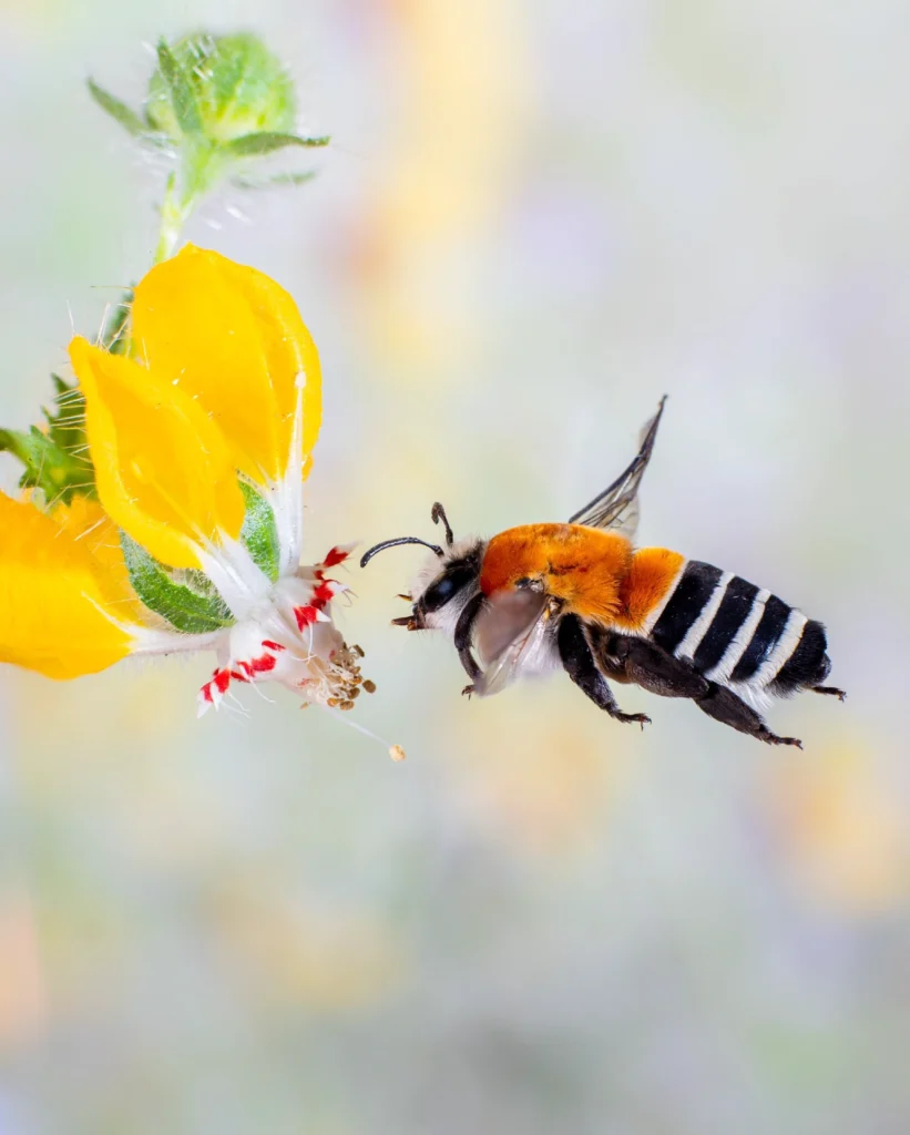 La ortiga caballuna (Loasa tricolor) es una planta endémica que habita laderas de cerros costeros e interiores de Chile central. Su nombre alude a los tres colores que componen su flor —amarillo, blanco y rojo— y también a los pelos urticantes que recubren tallos y hojas, capaces de provocar una intensa sensación de ardor al contacto. Sus flores presentan una arquitectura convexa particular: pétalos amarillos curvados hacia atrás que facilitan el acceso a las escamas nectaríferas rojizas, dispuestas como una invitación precisa. Este diseño favorece la visita de su principal polinizador: la abeja caupolicana de collar rojo, una abeja endémica sin aguijón, de bandas blancas y tórax anaranjado, que habita los mismos territorios costeros. En esta convivencia prolongada, flor y abeja han ido moldeando un vínculo estrecho en un mismo paisaje.