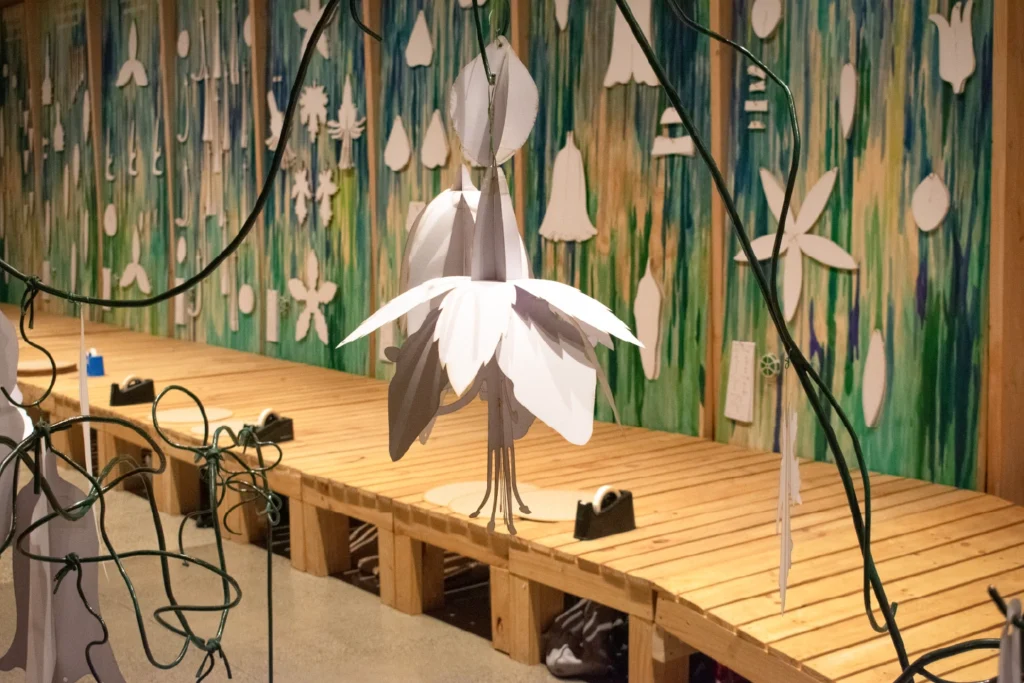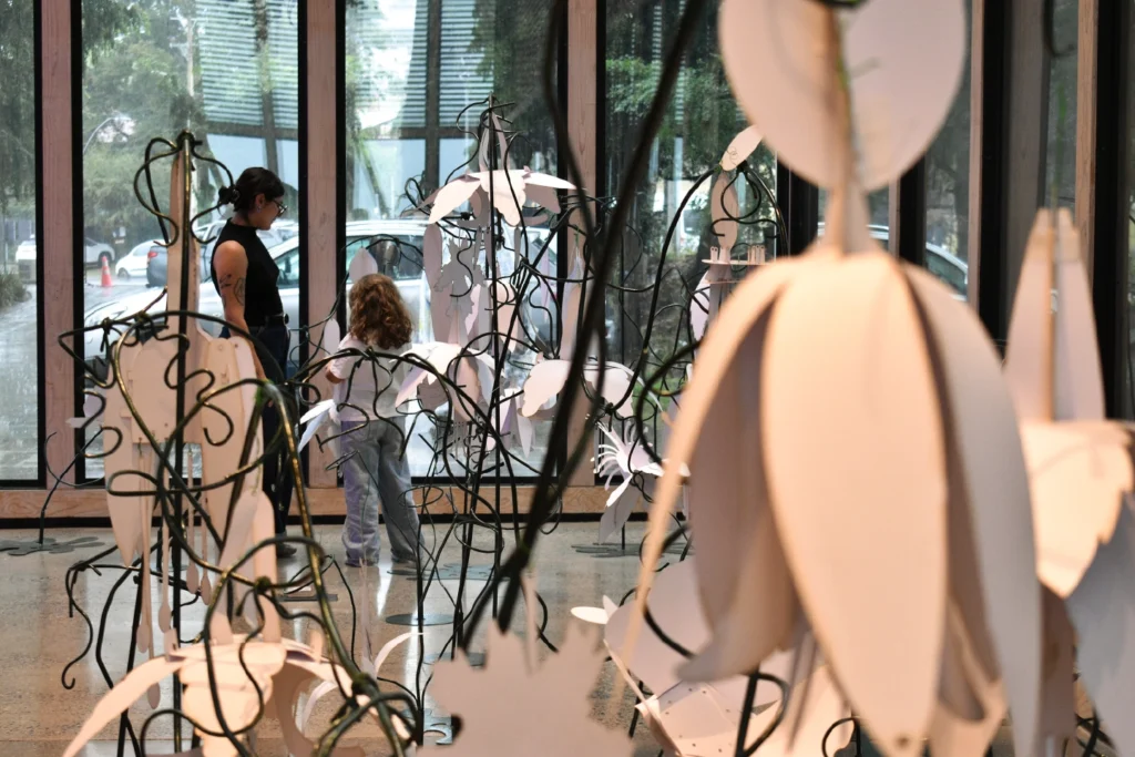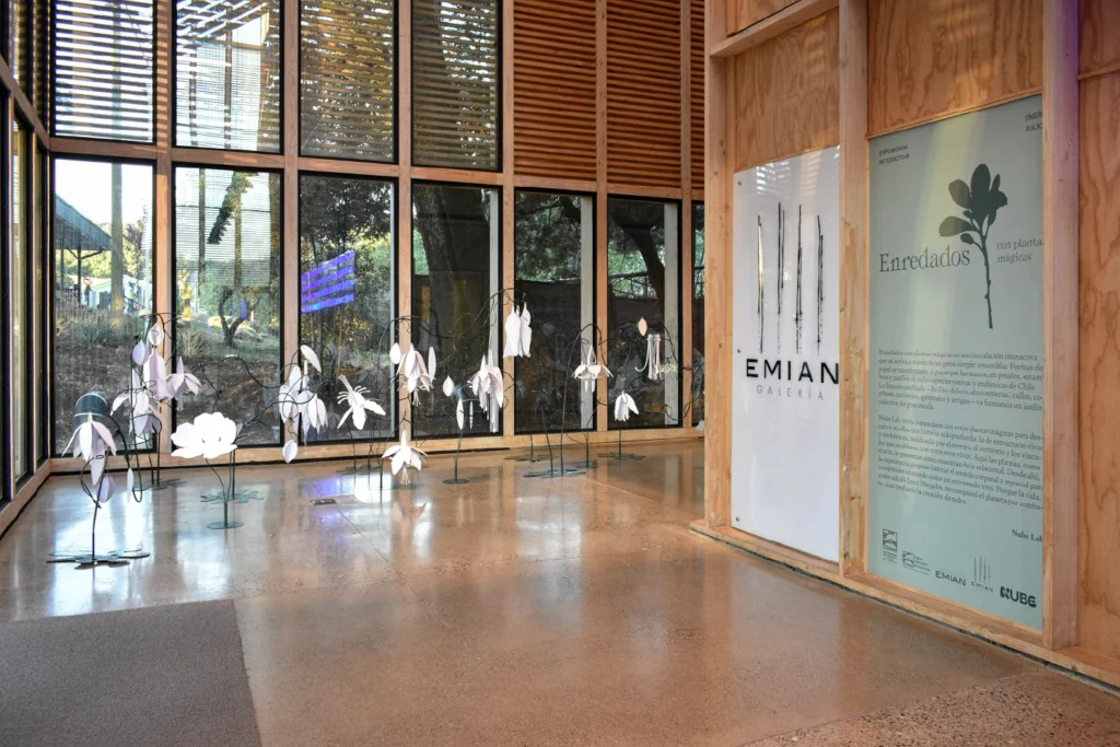 Entrar a la Galería EMIAN es ingresar a un taller: un espacio vivo donde el visitante no es solo espectador, sino agente activo de un proceso de creación compartida que transforma el lugar día tras día. Al inicio del recorrido, un mural presenta ocho especies florales nativas y endémicas de Chile con sus respectivos nombres comunes y científicos, junto a múltiples piezas modulares de papel. Lo que a primera vista parecen formas abstractas son, en realidad, los componentes básicos de la vida vegetal —pétalos, estambres y pistilos— esperando ser articulados.