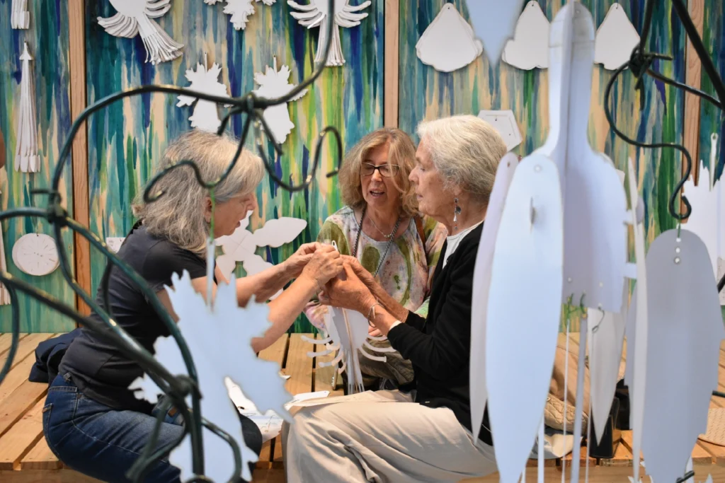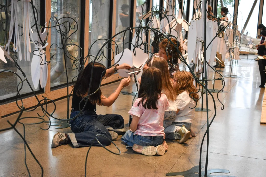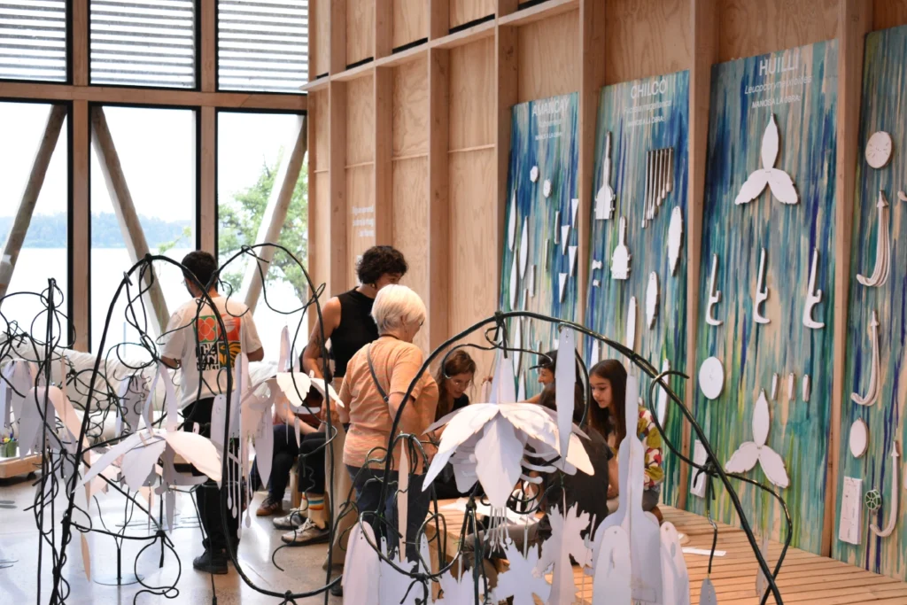 A través del acto manual de ensamblar, la abstracción cobra identidad y, entre las manos de niños y adultos, comienzan a aparecer siluetas reconocibles: la forma tubular del copihue, la arquitectura convexa de la ortiga caballuna o la apariencia danzante del chilco. Este gesto, sin embargo, nunca ocurre en soledad. Cada flor requiere atención y la lectura de un pequeño instructivo ilustrado; alguien lee, otro ensambla, otro sostiene o fija la cinta y el alambre. Acciones simples, pero que implican coordinarse, escuchar y hacer con otros. En ese hacer compartido, las formas no solo se construyen: se reconocen, se nombran y se comprenden desde el tacto, la atención y la colaboración.