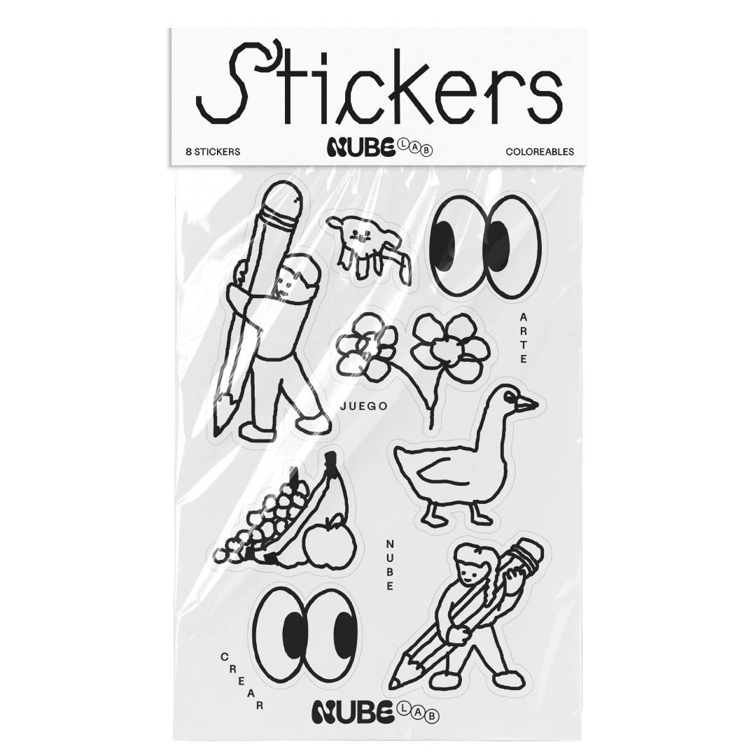 Stickers coloreables ilustrados por el artista Aníbal Bley, con toda la estética lúdica de Nube. Ideales para decorar cuadernos, cartas, laptops o cuando quieres sumar un gesto simple y divertido a tus objetos cotidianos.