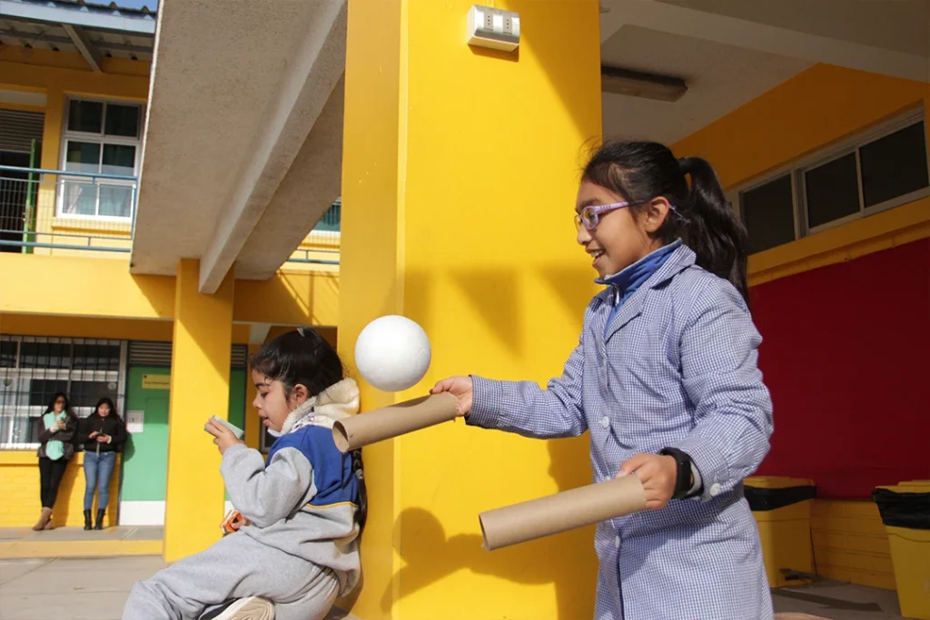Asimismo, este año quisimos explorar más a fondo cómo activar los recreos escolares. Para ello propusimos la Caja Recreo, un dispositivo compartido lleno de objetos simples —cuerdas, pelotas, telas, tubos de PVC, pinzas de ropa, ovillos de lana— puestos a disposición de los niños y niñas para el juego libre. No se trata de una caja cualquiera, sino de un punto de partida para la imaginación: en cada recreo, la caja convoca a un grupo de estudiantes que rápidamente transforman el patio en un escenario de invención colectiva. Allí se sientan sobre alfombras, inventan juegos de equilibrio, encestan pelotas de ping pong en improvisados aros y prueban cómo sostener estructuras con tubos. La Caja Recreo demuestra cómo la creatividad se despliega en su forma más cotidiana: jugando.