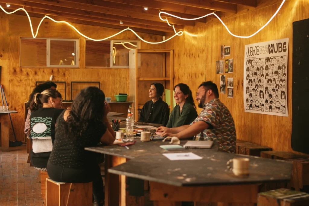 La residencia —realizada entre el 19 y el 23 de enero en el taller de Nube Lab, en Santiago— marcó el punto de partida de este camino. Durante una semana, Catalina Landeros, Cynthia Martin, Gabriela Núñez, Jullian Pinto y Sebastián Gómez habitaron el taller de Nube, compartiendo el día a día del equipo y participando de una experiencia formativa diseñada para vivir, desde dentro, el cruce entre arte, educación y comunidad que propone el Método Nube.