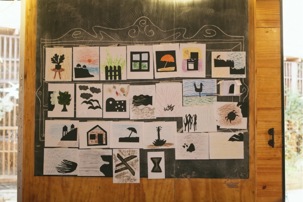 Uno de los primeros ejercicios fue la actividad “Gabinete”, diseñada originalmente por Javiera Navarrete en una residencia anterior junto a artistas, mediadores y docentes de la Región de Coquimbo. La propuesta invitó a crear un gabinete colectivo a partir del dibujo y el recorte de objetos e imágenes significativas para cada participante. A medida que el gabinete se iba poblando, comenzaron a aparecer escenas con su propia temporalidad; se habló del tiempo de la costa, la pausa que existe fuera de la época estival, las casas vacías con muebles detenidos en el tiempo; aparecieron casas sobre pilotes en los acantilados, rejas bajas y antejardines llenos de flores. También el polvo color arena, los opiliones y arañas pollito. La playa se instaló como imagen de fondo con quitasoles y roqueríos, con sol y niebla matutina. Sin proponérselo, el gabinete comenzó a dibujar un paisaje compartido de El Quisco, un primer gesto de lectura sensible del territorio.